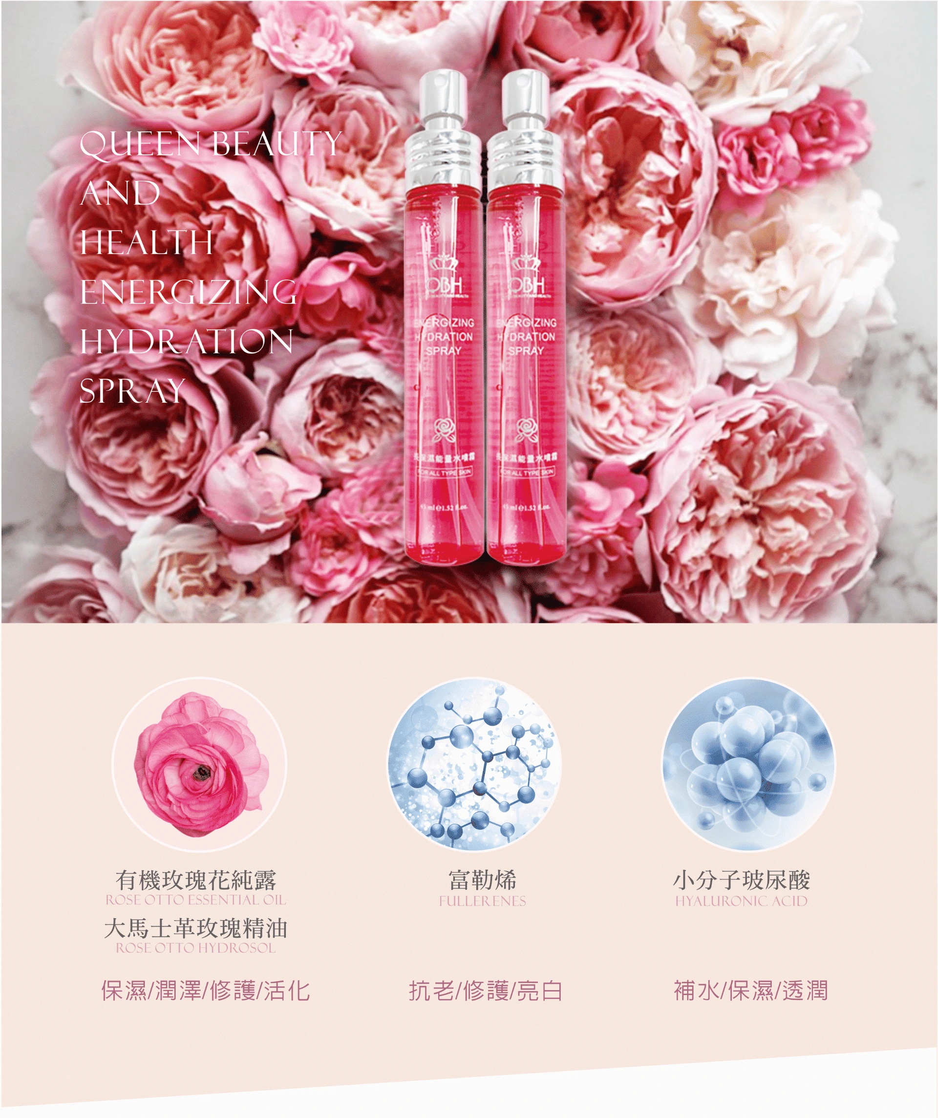 主要成分:玻尿酸、富勒烯、有機大馬士革玫瑰純露、大馬士革玫瑰精油