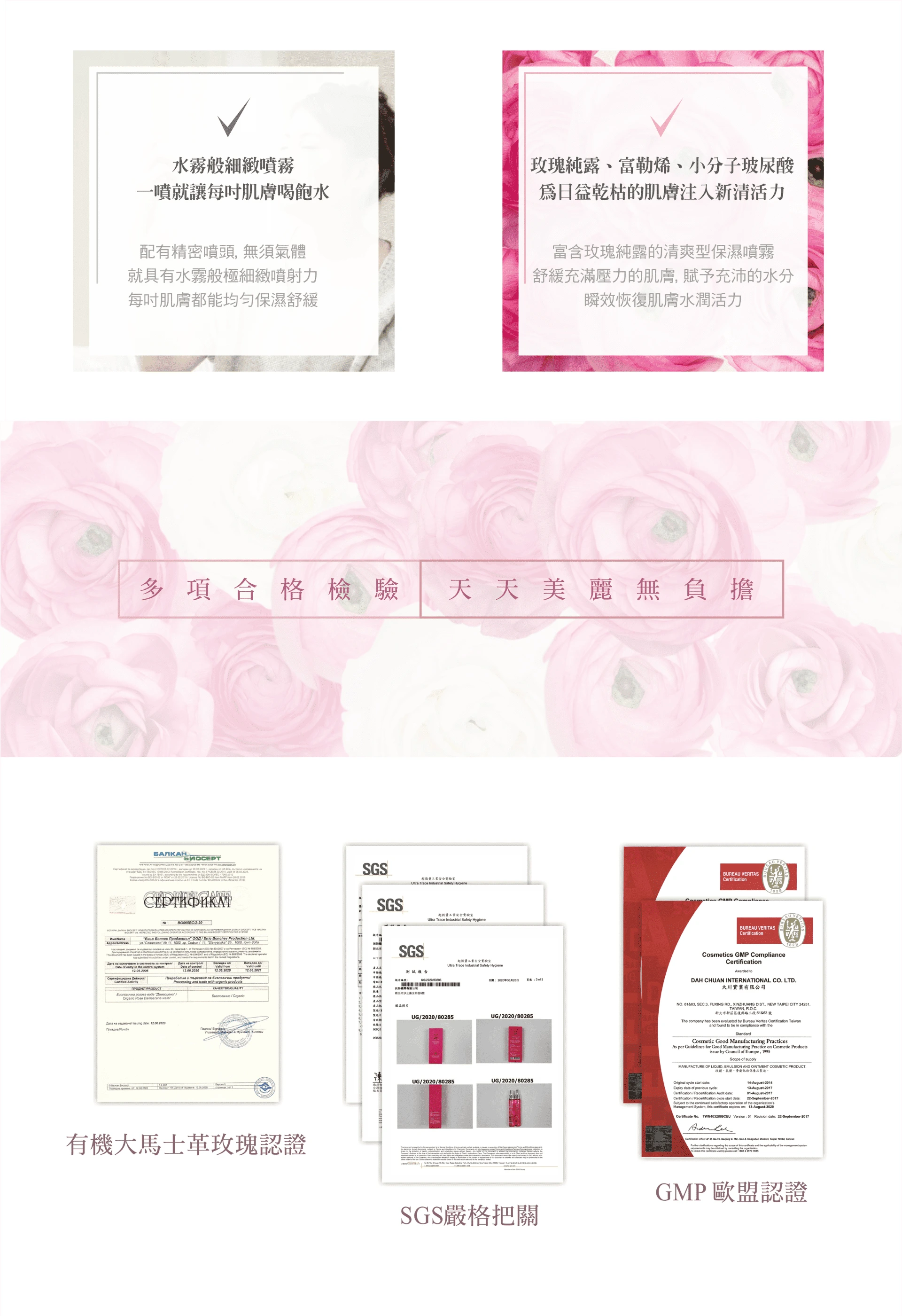 ・高效保濕:有機大馬士革玫瑰純露、大馬士革玫瑰精油。