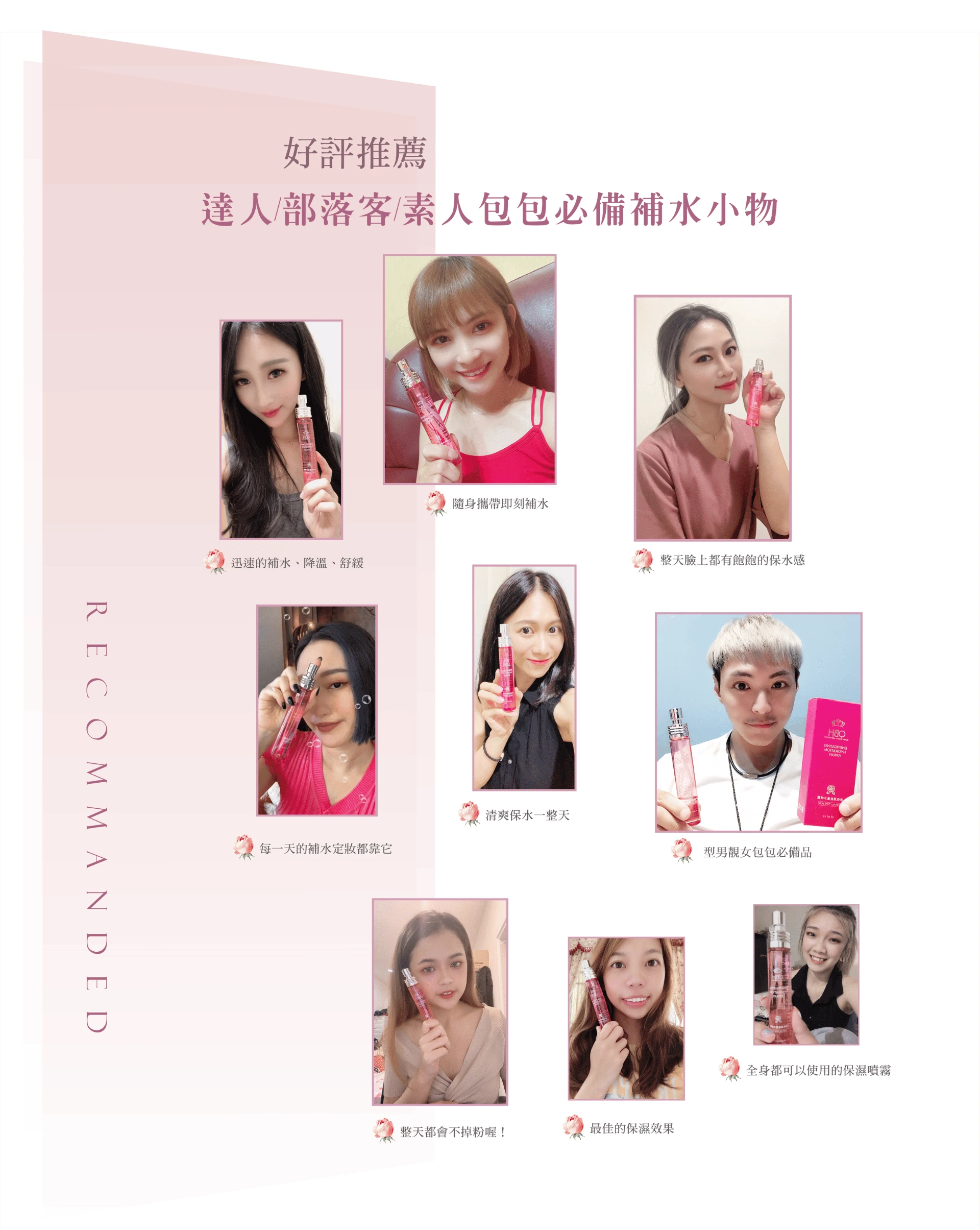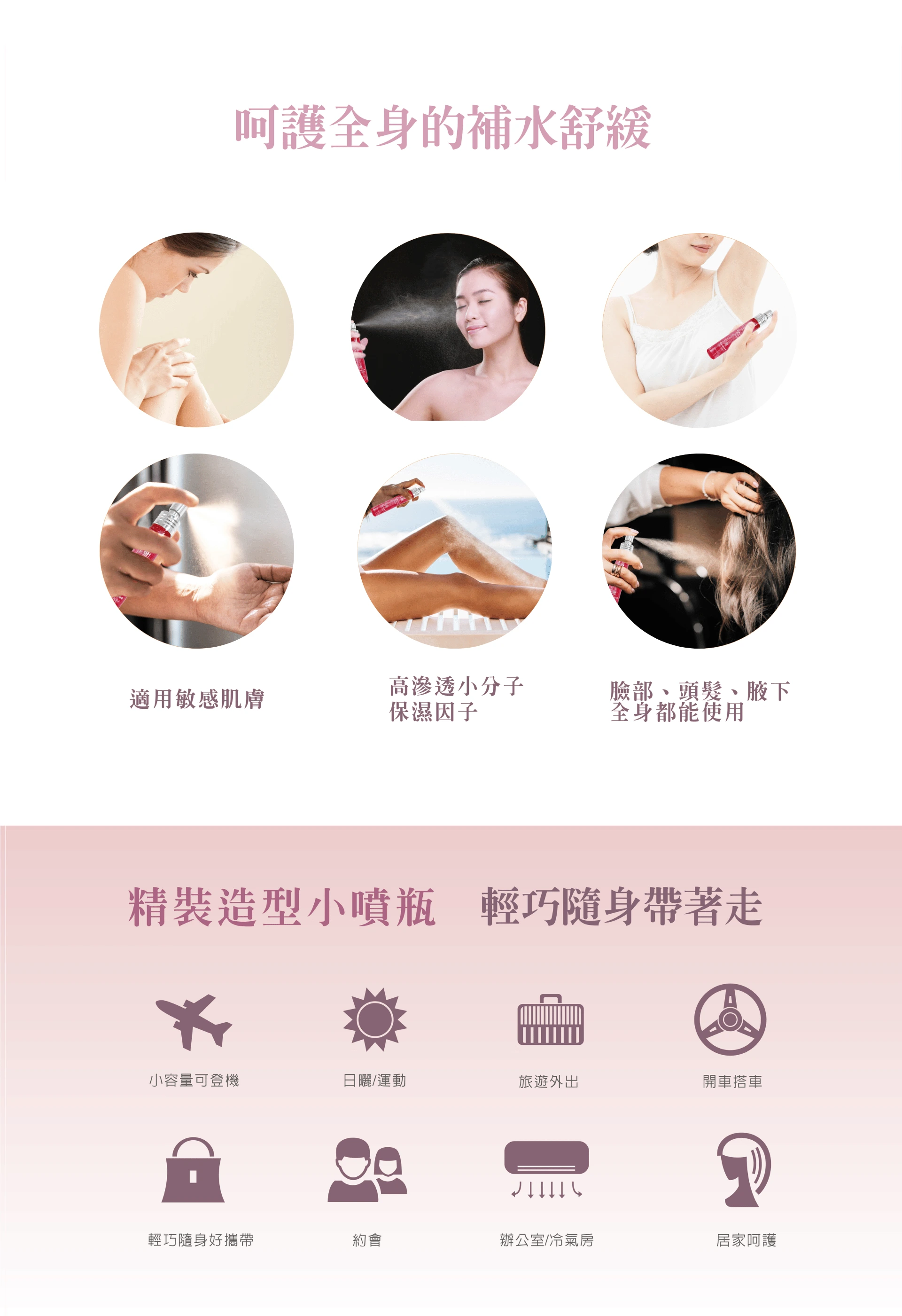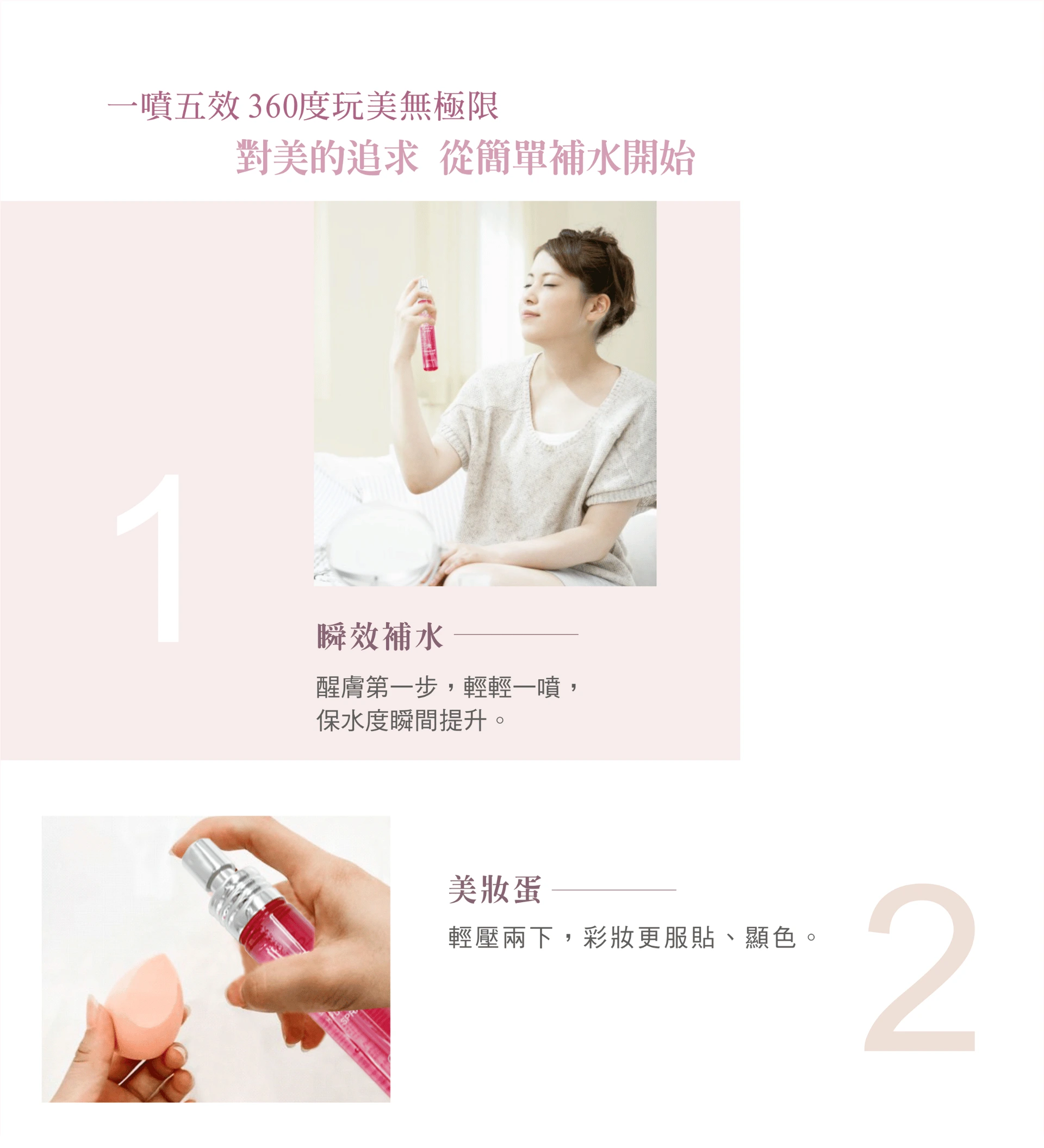 ・妝前噴-保濕;妝後噴-定妝;補妝噴-持妝。