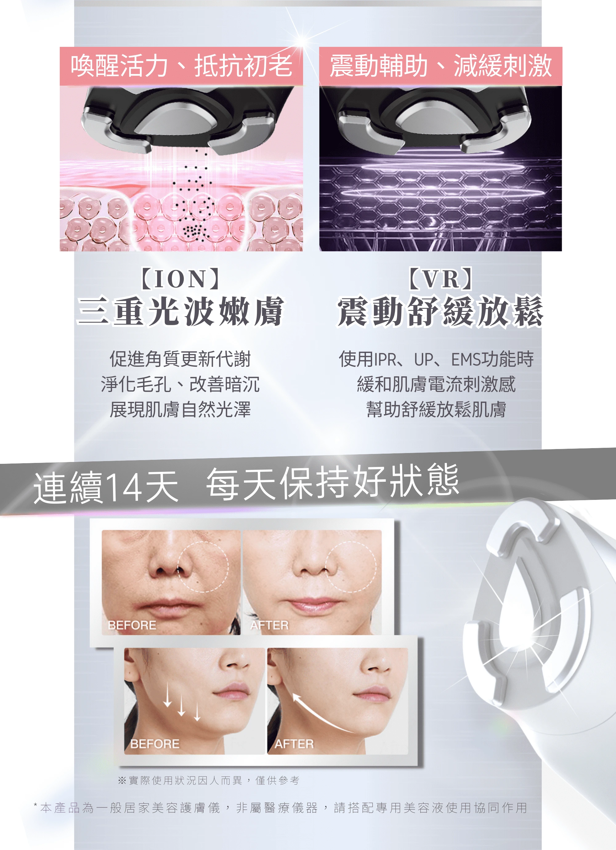★綻放肌膚之美|喚醒自然之力|補水保濕|清潔度UP ★提亮膚色皮膚光澤度|提拉緊致|亮白鎖水 ★改善臉部肌膚水屏障|提升彈性|毛孔縮小 ★防止肌膚老化|撫平皺紋|使肌膚回復柔順的輪廓線 ★輕柔的溫熱肌膚|震動提升肌膚舒適度|LED彩光護理