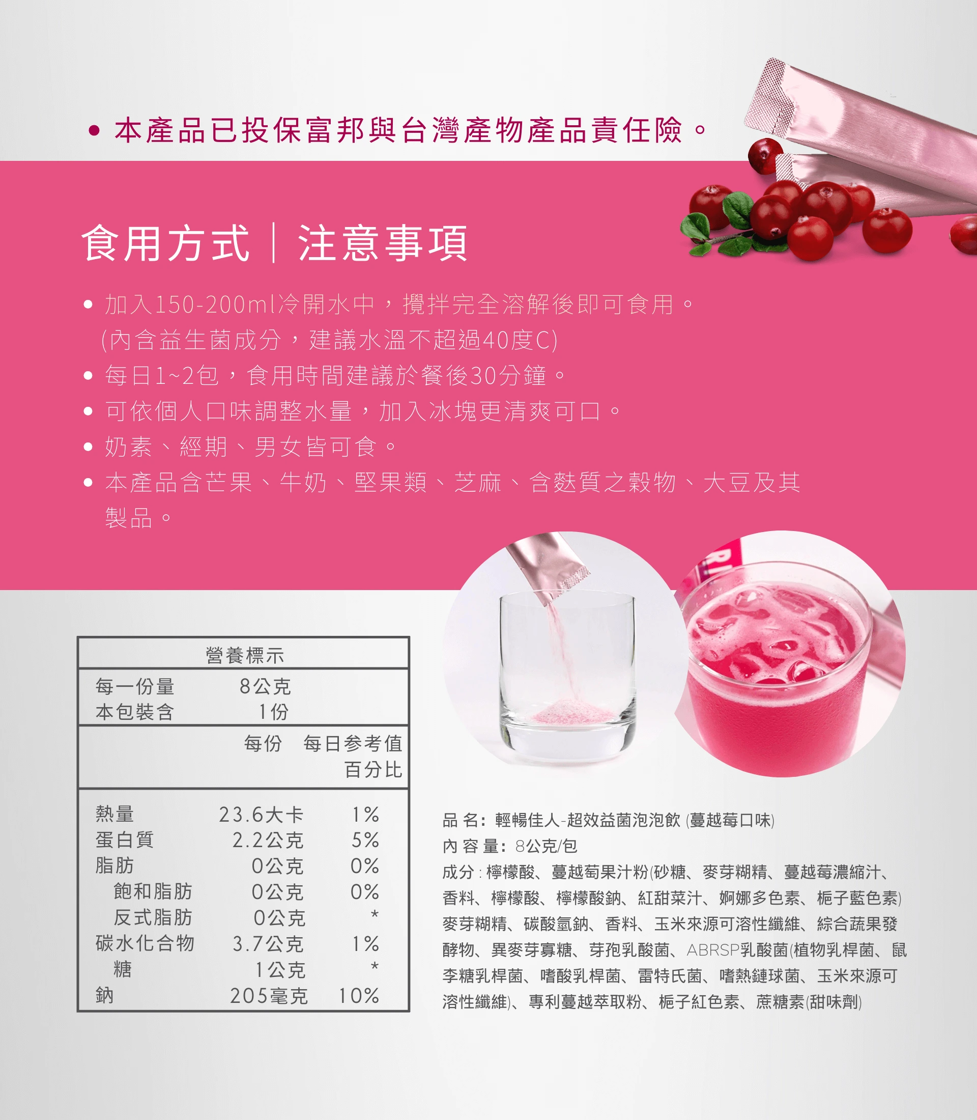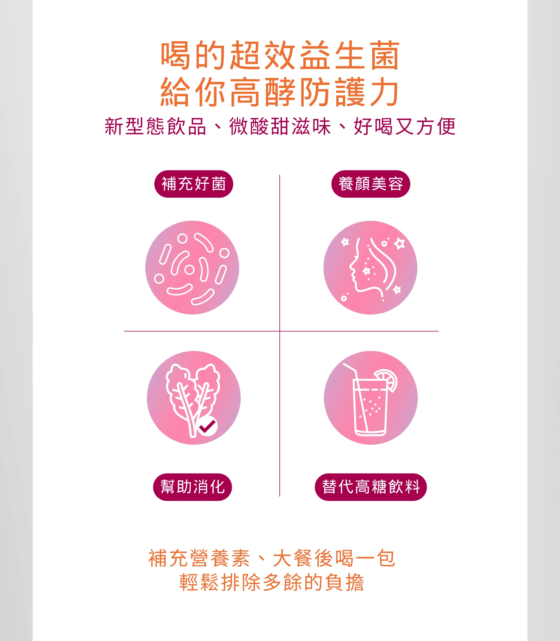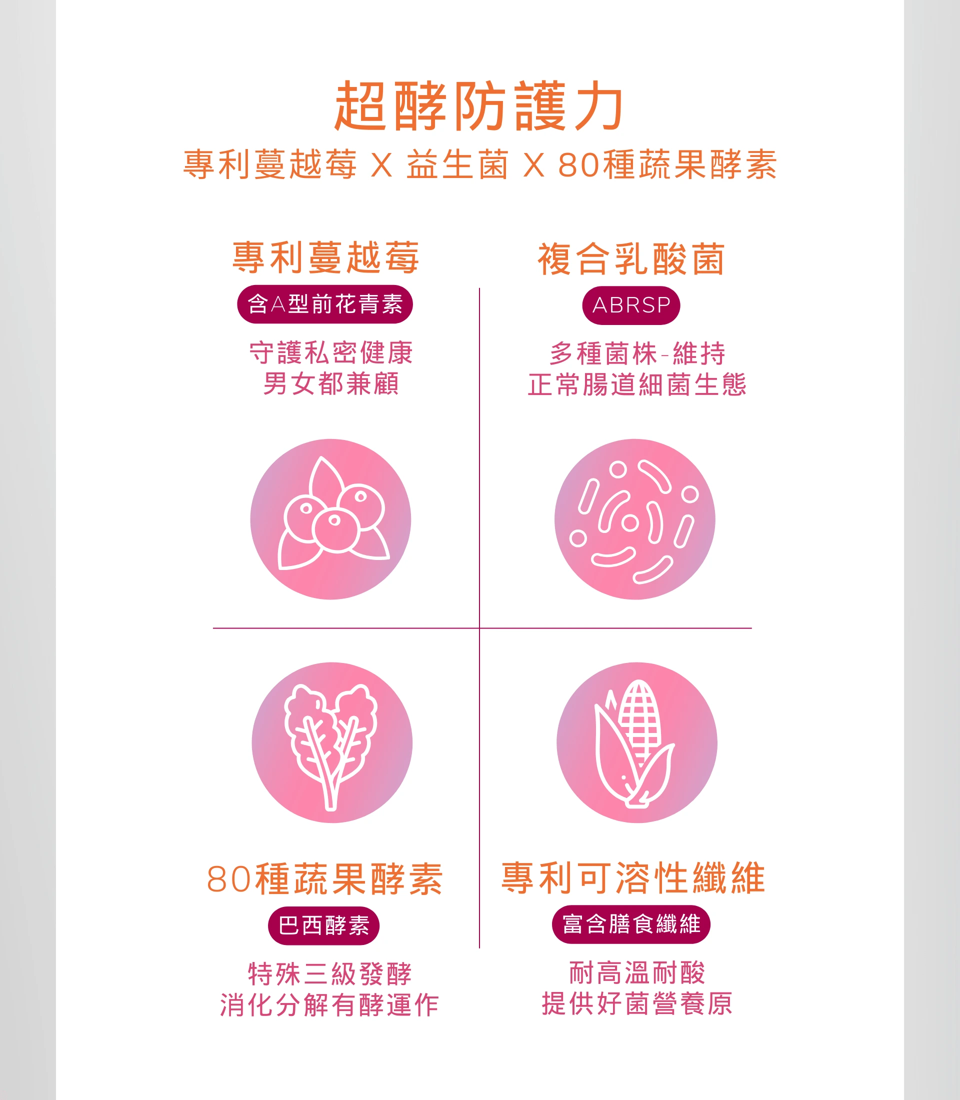 營養補給|養顏美容|輕盈順暢|私密保養 調節腸道菌叢、 促進腸道蠕動、幫助調節生理機能、增強保護力 *每天1包,養出輕盈體質與粉嫩氣色 *從腸道到私密,內在保養才是美麗關鍵! ・80種蔬果與酵素 ・專利認證蔓越莓 ・ABRSP複合乳酸菌 ・獨家特殊包埋技術 ・專利玉米來源膳食纖維 ✔專利認證 ✔ISO & HACCP驗證工廠認證 ✔本產品已投保富邦產物一千萬產品責任險 適合族群:生活壓力大、消化不良、蔬果不足、排便不順暢、私密處困擾 ✓奶素 ✓經期 ✓男女皆可食